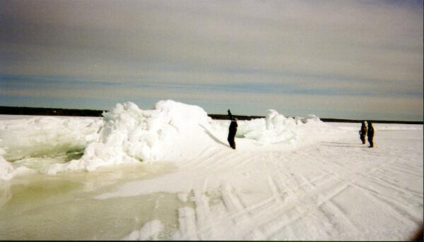 One of the many ice ridges you had to look out for this year. Because the snowfall was way down from years gone by, the ice froze solid blue-green 3 to 4 feet thick creating some of the biggest and the most abundant ridges we have ever seen. This pic was taken on Eagle Lake